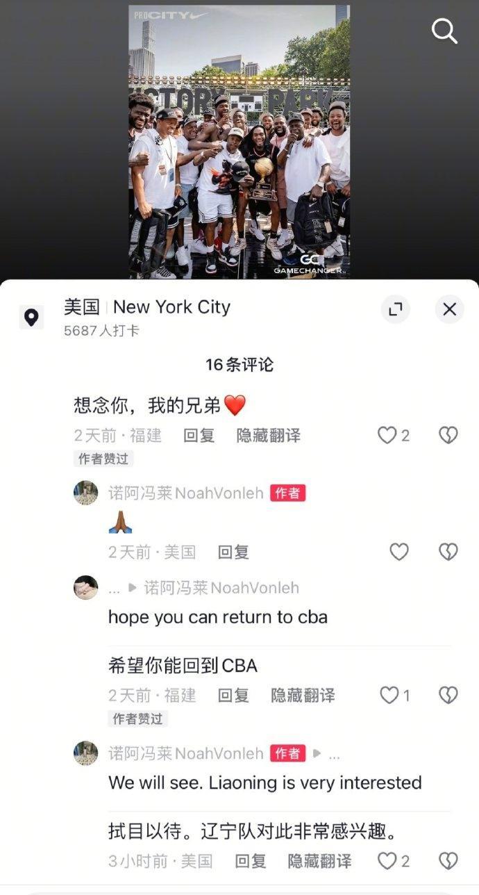 直播吧8月26日讯 近日,前CBA外援冯莱在社媒和网友互动。他表示,辽宁对自己非常感兴趣。