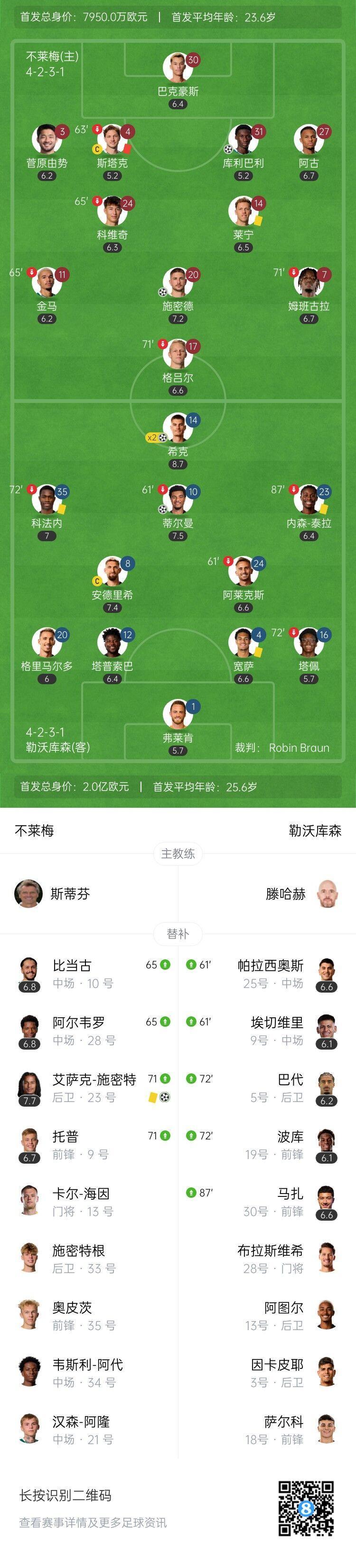 第76分钟,弗莱肯出击失误没碰到球,施密特面对空门将球轻松送进!2-3!少打一人的不莱梅追回一球!↓